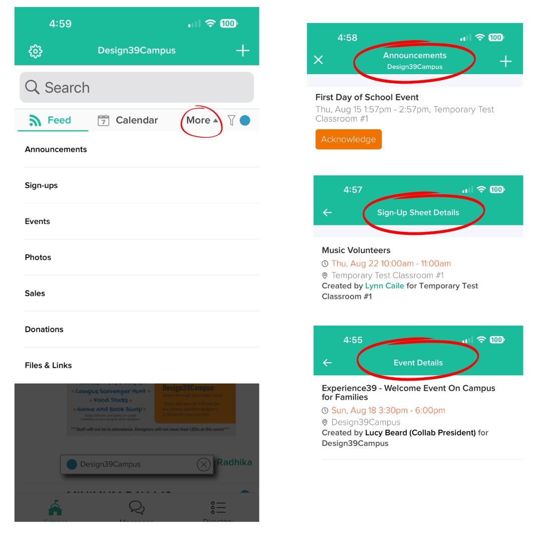 Feed shows all announcements, upcoming events, sign-up. Tap items in the feed such as a signup listing for more information.